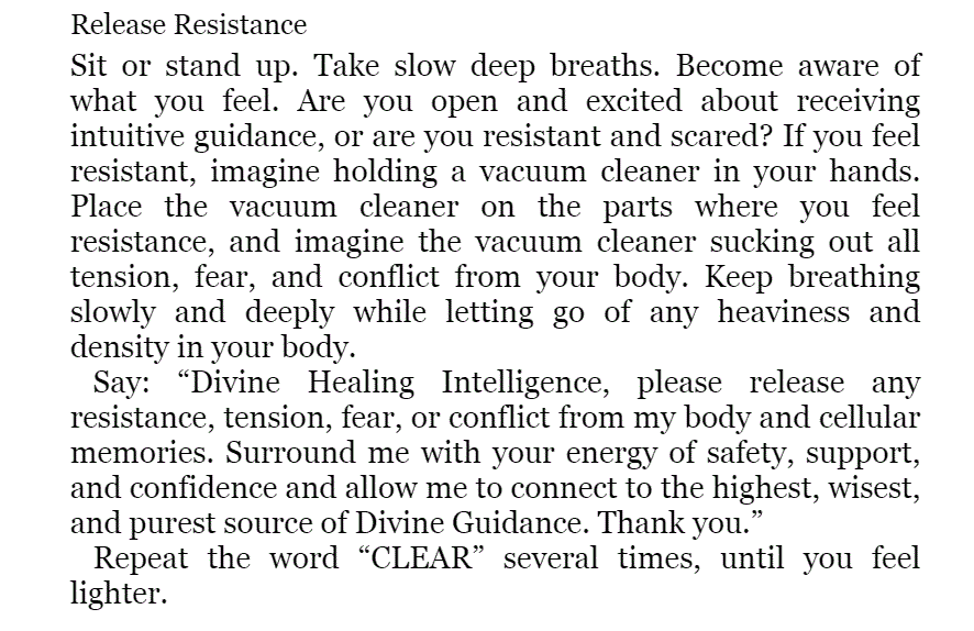 I really love her visualisations which get you to imagine a colour and then to say an invocation, and the word CLEAR out loud. For example, “Release Resistance.”